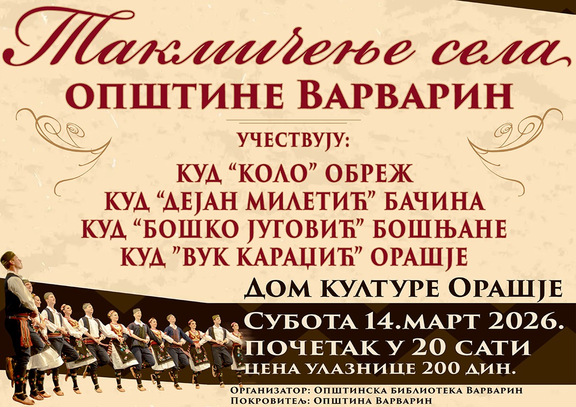 Љубитељи фолклора и традиције имаће прилику да уживају у богатом културно-уметничком програму и на овогодишњој манифестацији “Такмичење села општине Варварин”, која ће свечано бити отворена у суботу, 14. марта, у Дому културе у Орашју, са почетком у 20 сати.