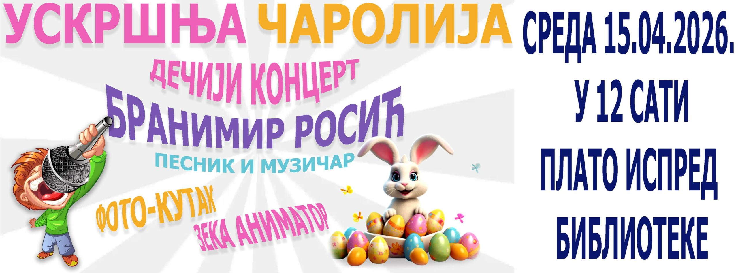 У организацији Општинске библиотеке “Варварин”, а под покровитељством Општине Варварин, у среду, 15. априла, са почетком у 12 часова, на платоу испред библиотеке биће одржан програм под називом “Васкршња чаролија за најмлађе”. Реч је о празничном дружењу намењеном најмлађим суграђанима, које ће, уз богат и разноврстан програм, донети праву васкршњу атмосферу и бројне занимљиве садржаје.