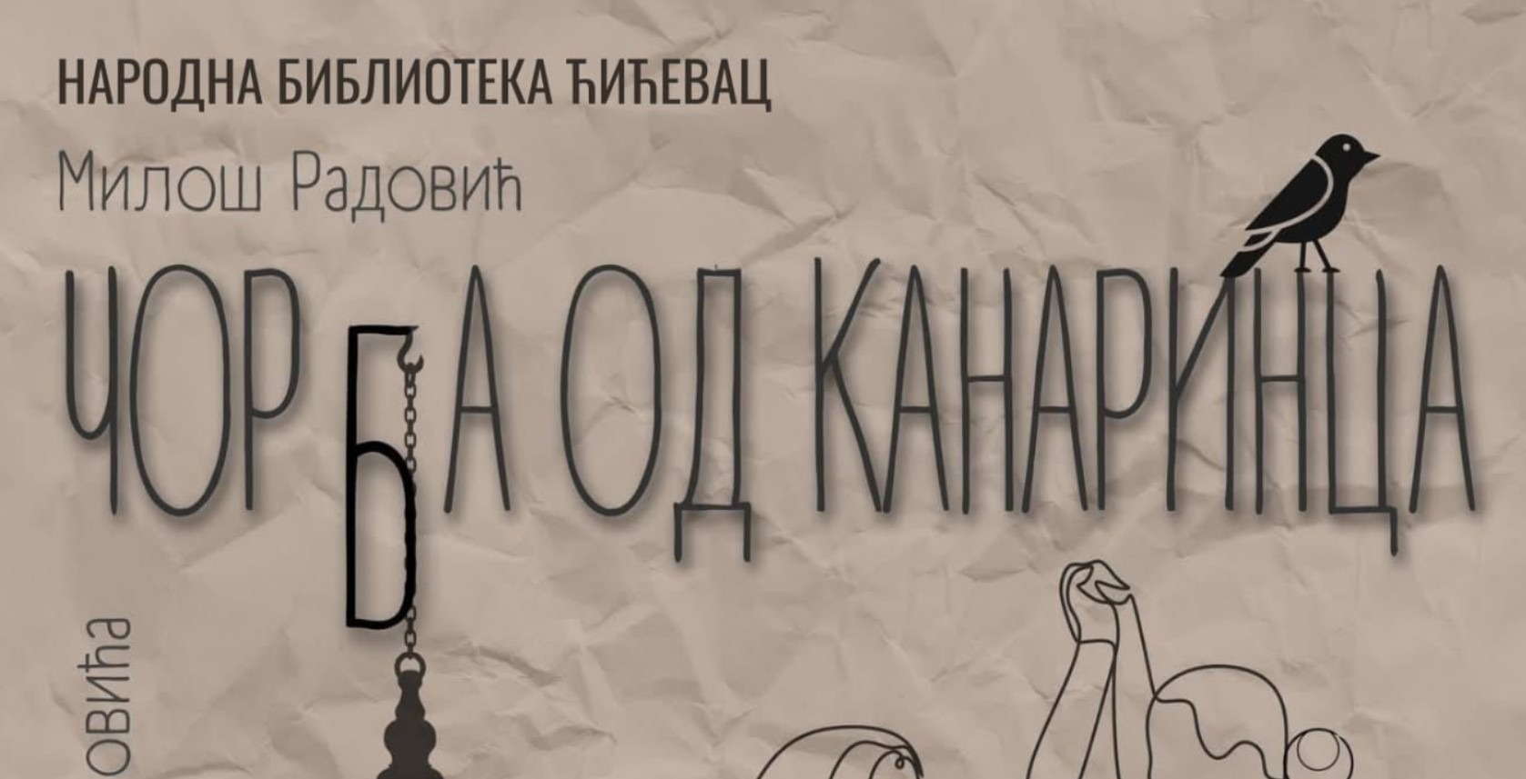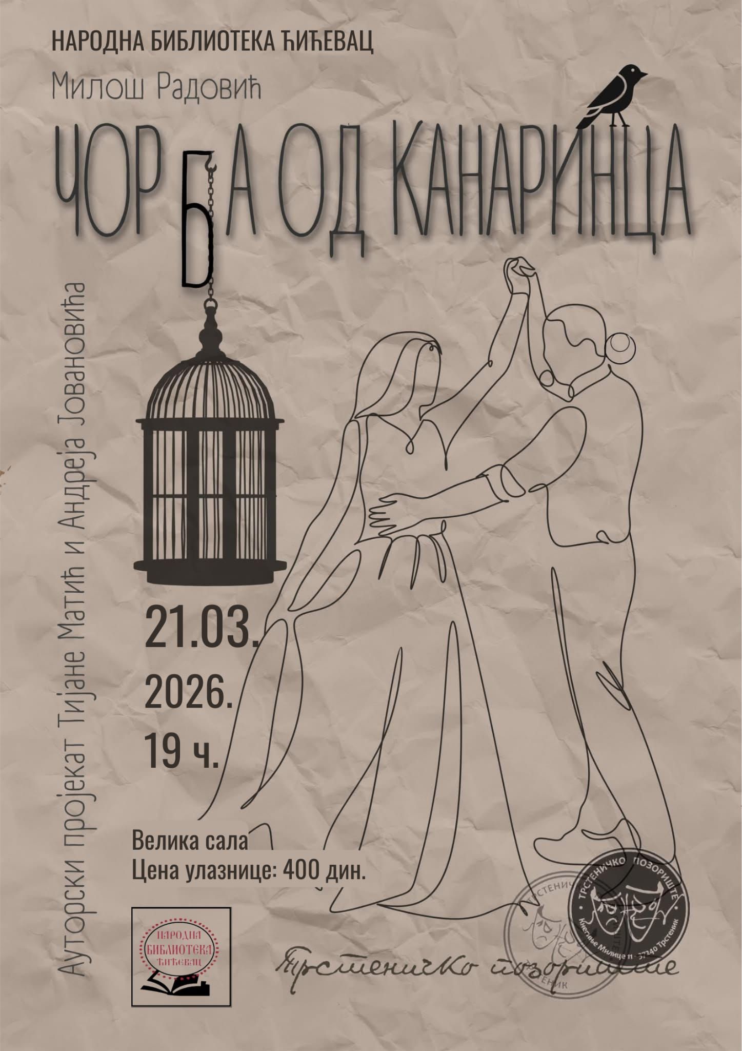 У организацији Народне библиотеке “Ћићевац”, љубитељи позоришта имаће прилику да 21. марта 2026. године присуствују извођењу представе Трстеничког позоришта “Чорба од канаринца”, по тексту Милоша Радовића. Представа ће бити одиграна у Великој сали Народне библиотеке “Ћићевац”, са почетком у 19 сати.