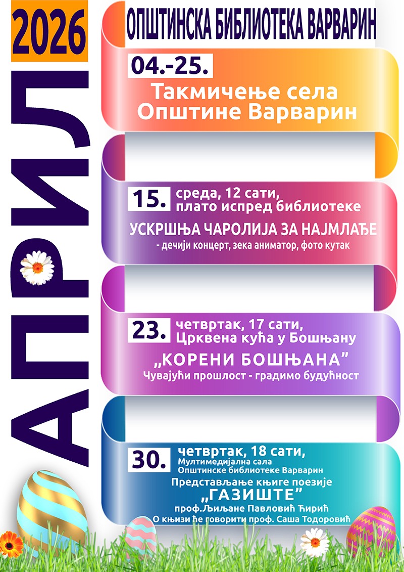 Из Општинске библиотеке “Варварин” позивају суграђане да присуствују планираним догађајима и да током априла буду део културних и празничних садржаја у Варварину и Бошњану.